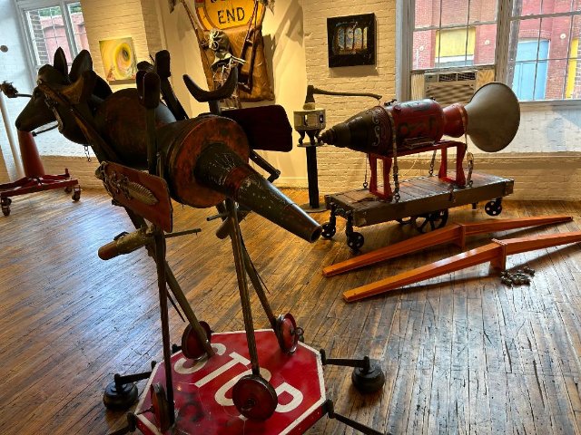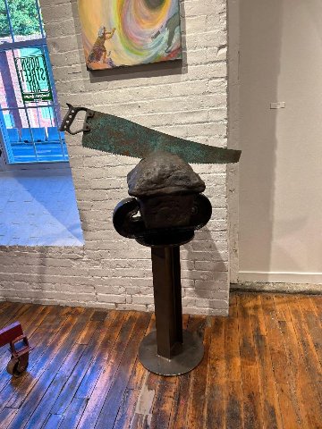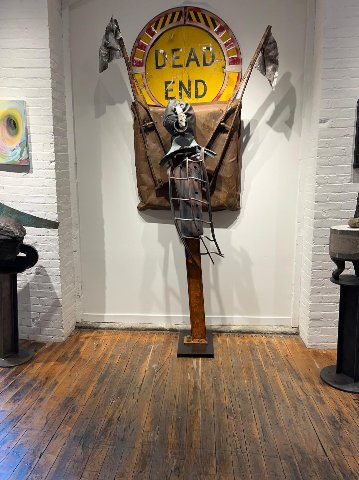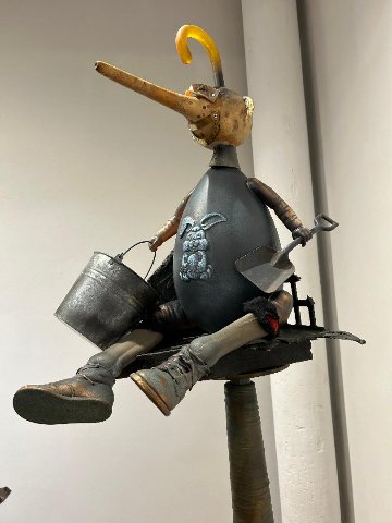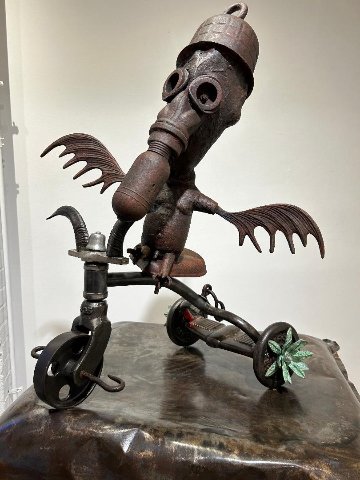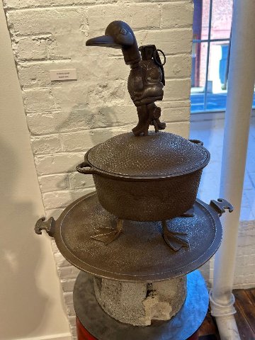 Where do his subjects come from? Pointing to his head he explained that he gets inspired with ideas. In some instances the found objects suggest themselves. “Duck and Cover” is quite literally just that with a double entendre. He found a metal pot and fabricated a duck on top. It’s a work of pure serendipity.