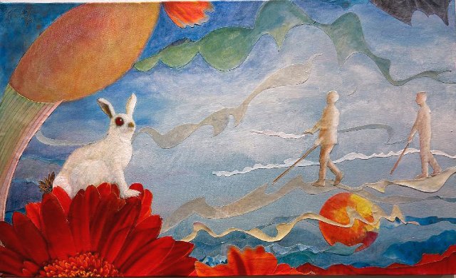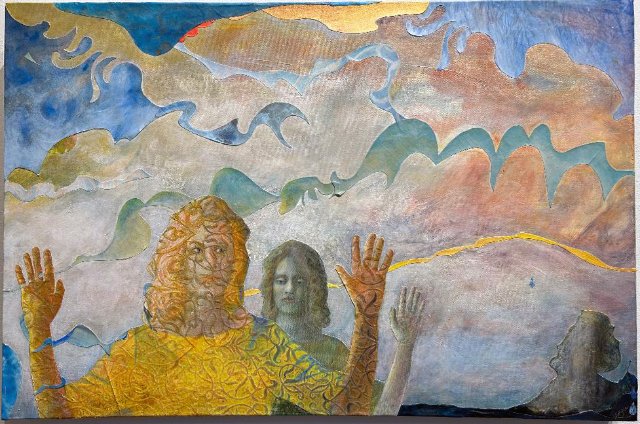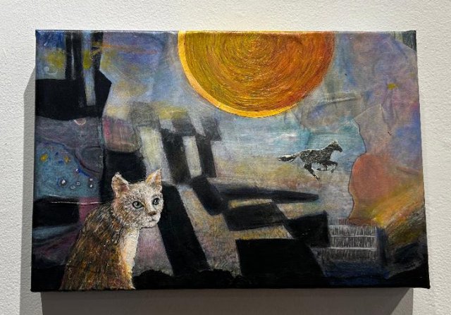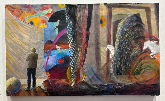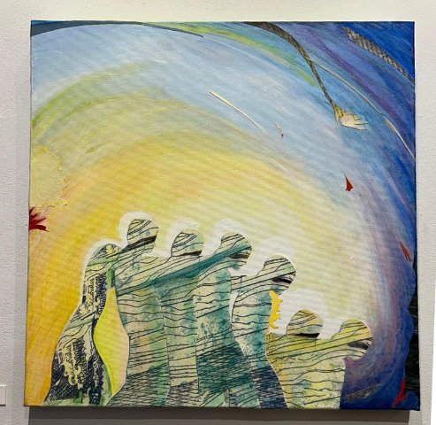 Confronting the individual works each seems to be a response to a specific trope. Other than commonality of execution, collage and paint on canvas, there are a number of variations of mood and inspiration to experience. This reflection on inner feeling is a bold departure for the artist and we will note with keen interest how this further intensifies. The risk taking is to be appreciated and lauded.