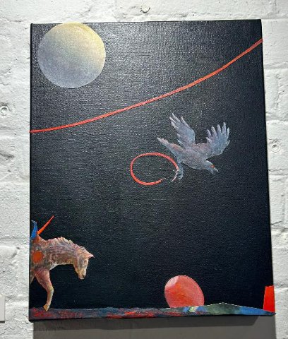 On the walls are 17 intimately scaled, collaged, acrylic paintings by Joanna Klain. The space of the gallery is chock-a-block, gob smacked with multi media, assembled metal sculptures by Richard Criddle.