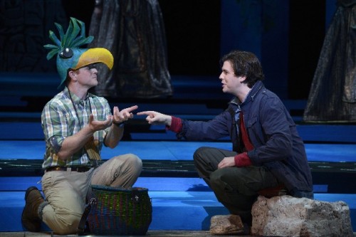 The arcane Masonic material minimized, the opera essentially becomes a fairy tale with the requisite magic elements. The hero Tamino is bitten by a snake – in both the original and in the BLO adaptation – and is saved by three mysterious ladies who, after drooling over his beauty, introduce him to the imperious Queen of the Night, who enlists him to save her daughter from an evil sorcerer. Shown a picture of her Pamina, Tamino falls instantly in love, singing one of Mozart’s loveliest tenor arias to her image, and sets off to liberate her. He is accompanied by a sidekick, a bird catcher named Papageno, a Natural Man of basic desires for food, drink and sex, who also seeks a wife. To protect them, the Three Ladies present Tamino with the magic flute of the title, while Papageno is given a set of magic bells.