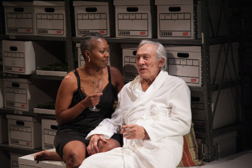 The production is made up of about 50 seemingly unrelated scenes in random order, some no more than a few seconds, and the longest lasting a few minutes. They are played out by 10 actors, all of whom play many roles, in an anonymous space fitted out with steel shelving units and corrugated file boxes of different sizes. The boxes themselves suggest data--as in all the boxes it takes to store the paperwork for a legal case or a consulting engagement--or the memories of a life. The scenes, skillfully choreographed by director Shawn Douglass, add up to a pastiche of love, memories and the need to make human connections in an era fraught with technology.