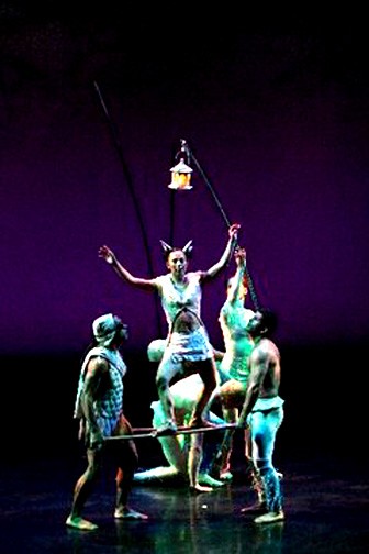 "Lanterna Magica" (2008) begins with two young girls pretending to capture fireflies in a forest. Soon, four men join them on stage. One of the men looks like a combination of a swan and a fighter pilot, if that's possible. Why? Your guess is as good as mine. The dancers playfully dart around the stage, exhibiting an acrobatic flair clearly meant to conjure up innocent characters straight out of "Peter Pan" or perhaps "A Midsummer Night's Dream." But a lot of tumbling around simply seems like kooky ways to fill up the first few minutes of the show. If this newer work is the best that Pilobolus has to offer, Pilobolus is in trouble.
