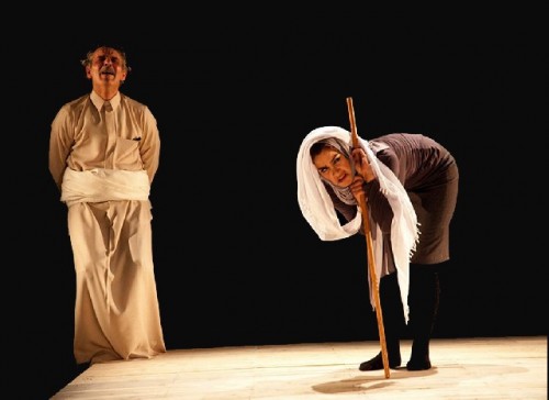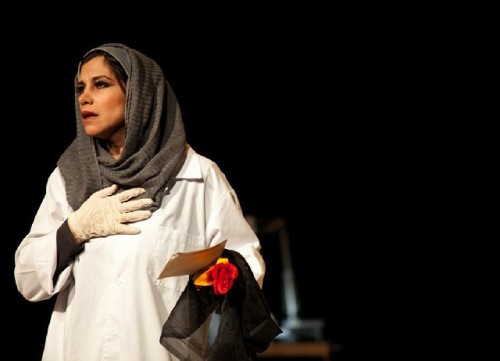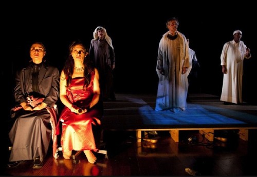 The director and actor reading from a lectern is surrounded by comedians from different nationalities Carole Abboud, Nawar Youssef, Nicolas Daniel, Nassar Al-Nassar, Amal Omran, Fayez Kozak, becomes a spectator as well, wondering about this freedom gained by the people through power struggle, hence also questioning the fate of the theater and its artistic creation.  The acting is often contrite, with scatatto movements; noteworthy is the masterful metamorphosis of actress Nowar Yosef from a virginal, innocent maiden to a dominatrix figure.  Also, Fayez Kozak performs bravely the role of the Mullah.