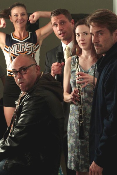 Meanwhile, Nick Cagle as a pompous, self-absorbed, opportunistic, TV reporter along with Glover and Gorell-Getz – portraying several roles in the comedy – rake-over-the coals the favorite whipping boys of the establishment: corporate greed, the government’s entrenched politicians, and those who support the alienation of the masses, etc. Fig on the other end of the spectrum explains to Eunice the clarity and the appeal, at least for him, of Brechtian themes and its philosophy. “ …People need to think for themselves, and not be led around by others,” he laments. The result being that neither side moves from their fixed positions (now that sounds familiar).
