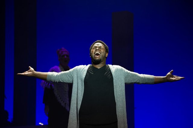 A matter of life and death may not suffuse the action in “The Steam Train.” However, in the song, a teenager from a poor neighborhood in New York expresses a strong drive to become a basketball star. Darius J. Manuel sings the song with a strong sense of purpose. The result is you don’t doubt for an instant that he will do whatever it takes to achieve his goal. Competing with his bravado, though, is a spoken monologue. It reveals the factors stacked against the young man in his quest. By inserting the spoken monologue, which company members voice, Brown adds tension, which we keenly feel.