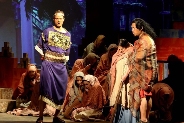 Veteran of recent West Bay productions, John Kun Park as Samson brings a powerful tenor voice and presence to the role. He is imposing in his portrayal, first strutting and energetic as the potent leader of the Hebrew people enslaved by the Philistines and later subdued as the blinded and weakened shadow of his former self. Park’s particular strength is in revealing anguish in his singing and acting, both when depicting rage and submission. Despite his ability to achieve great passion and volume, however, his timbre is a little muffled, having less than exemplary clarity.