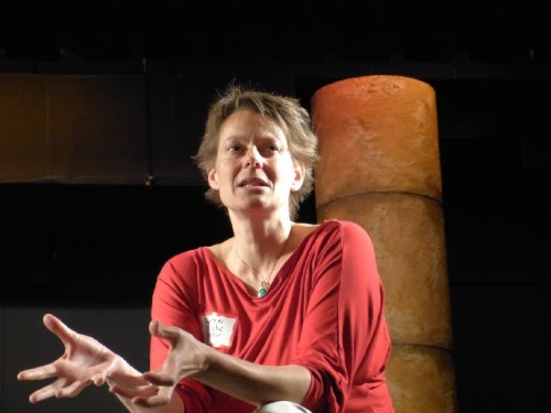 Van Ginhoven widened the stage, so to speak, by having the actors enter from the doors of the auditorium walking through the audience. This device was repeated later. With a tiny budget for a set she opted for two mobile columns which signified both the classicism of a fictive European city, as well as, suggestions of opera staging. The rest of the set mostly entailed chairs as props and some portable, all purpose stairs.