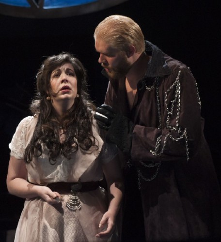 Both actors were visually right for the characters they assumed. As Duke Bluebeard, Dan Sorensen was tall and bearded, his blond hair slicked back like a Russian Mafioso. He wore an ankle length coat dripping with chains under which an open shirt exposed his pale and hairless chest. His visual image sent a chill across the theater.