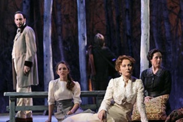 Nico Muhly composed music for this production, and among his talents are a deep sense of drama. Instrumentalists are tucked into a room which might be in the Ranevskaya home and move onto stage in the second act where they provide dance music. Although specific Russian songs are not referenced, the spirit of Cossack dance is lofted. Frenzied confusion of spiraling to the end, oblivious of circumstance is captured by Muhly in the dance scene. Director Godwin draws in cameos during the party. Minor textures of the Volga might have enriched. Modernizing the play is one thing. Rooted in Russia is another.