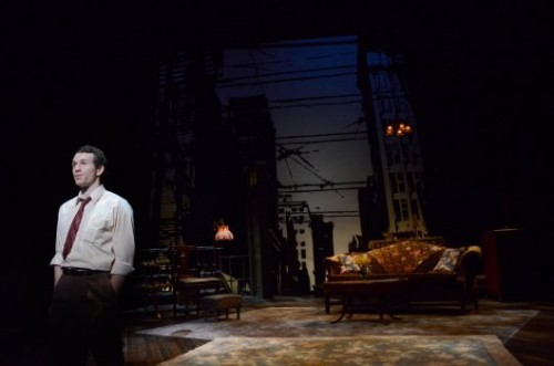 It’s not easy to pin down exactly how the creative team, under Pam Berlin’s intelligent direction, has achieved this delicate needle-threading. It starts with Michael Schweikardt’s terrific set, in which the period-specific Wingfield living room is backdropped by a two-dimensional cityscape silkscreened (or painted? I spent much of intermission trying to figure out just how this scenic feature was made!) on a seamless screen, which in turn is framed by silhouette cutouts of fire escapes. What is memory, if not simultaneously as sketchy as that backdrop and as perfectly detailed as that living room?