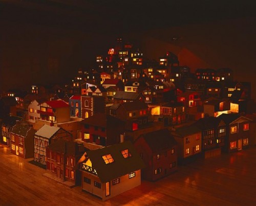 Rachel Whiteread's new show in the contemporary gallery at the MFA is a necropolis. The hundreds of dollhouses, arranged on simple boxes to cleverly emphasize the feeling of a gently rolling hillside, occupy a dark and silent room. Smaller houses have been placed further away in the back, to emphasize perspective, and each house has been carefully illuminated with electrical wiring so that windows glow in the night.