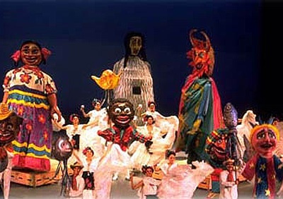 The first act finale brought us to the eve of January 31st and the celebration of the the Candelarla Virgin in the town of Tiacotalpan. On two platforms, symbolizing the stages the town erects each year, dancers launched into traditional fandangos, whose origins are clearly in the flamenco traditions of Spain. Stomping feet, upthrust arms, and "postura" permeate the proceedings as one dancer outshines the next. Finally come the mojigangas, enormous puppets that symbolize different cultural figures and archetypal human characteristics.