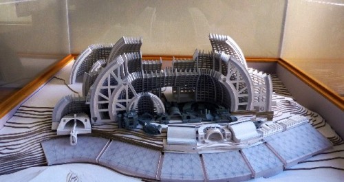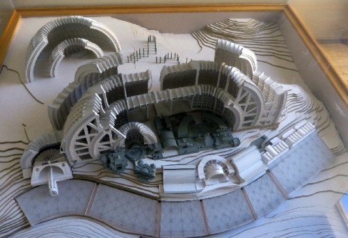 In the areas for bronze and ceramic crafting this activity is located beneath hemispheres for shade during the summer and to capture and covey indoors the heat of kilns and foundries during the winter. We passed by clusters of apartments and common areas. There was an open outdoor theatre. Above were wires to suspend movable canopies for shade and shelter for rain. In front of the stage is a moat for cooling as well as to improve acoustics.