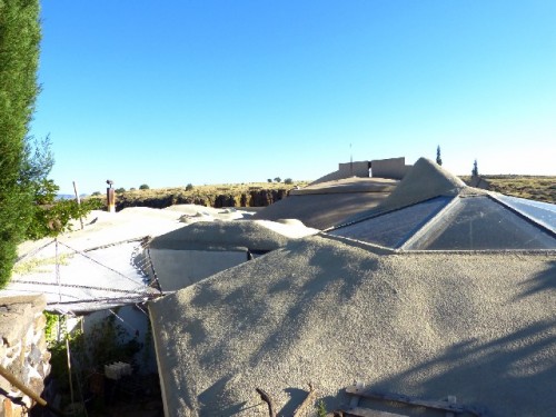 The site is exposed to extremes of weather. Summer temperatures hover around 100 degrees. Winter temperatures are at and below freezing. Using passive solar there are large windows to capture the heat of winter sun. During summer they are whitewashed with a layer of lime. This surface reflects light and is readily hosed and scrubbed off for winter.