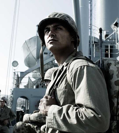 By contrast Eastwood is all over the place back tracking between gritty battle scenes, glimpses of the survivors and their heirs today, the "heroes" on tour with the Bond drive, and then some burrowing into the personal history of the individuals involved. The most important back story involves Ira Hayes, a Native American played by the Native actor, Adam Beach. The film dwells on just why he tried not to be tapped for the Bond tour preferring to stay in the battle he was trained for. It ensues that he has a much tougher fight on his hand coping with the blatant racism that bombarded him. The other soldiers call him "Chief" and on the road he devolves into the stereotype of the "drunken Indian." A cornball yahoo politician at a reception asked Hayes if he "used a tomahawk" during the battle. It's meant in humor but in hindsight it is a stinging insult. By the end of the publicity tour he was a shattered wreck of a man. His life ended in tragedy and he is shown face down dead in a pig sty. So the compelling story of Iwo Jima is that minorities- Blacks, Asians, Natives, Latinos, Italians, Poles and Jews- were good enough to fight and die on the beaches of Iwo Jima only to come back home to good old racist America. There is no racism in a foxhole but plenty to go around on the mean streets of the US of A.