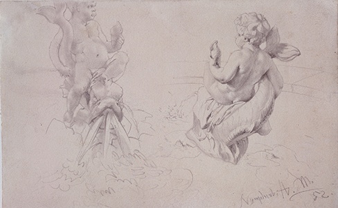 The Clark is concurrently offering a small exhibition of recent acquisitions on paper, including a typical, and rather fine pen and wash drawing of the Annunciation by Luca Cambiaso (Moneglia, Genoa, 1527 - Madrid 1585) and a group of interesting studies by Jacques Villon (France 1875 - 1963) of a bust of Baudelaire by his brother Marcel Duchamp-Villon (France 1876 - 1918). However, I'd like to point out a tiny pencil study by Adolf von Menzel (Breslau 1815 - Berlin 1905), which I especially enjoyed, a study of Baroque putti, details of a fountain at Nymphenburg. Menzel, who roamed all about Berlin and its environs with his sketching pad, here combines baroque ornament and line with his own sharp, quasi-photographic eye for light and form.