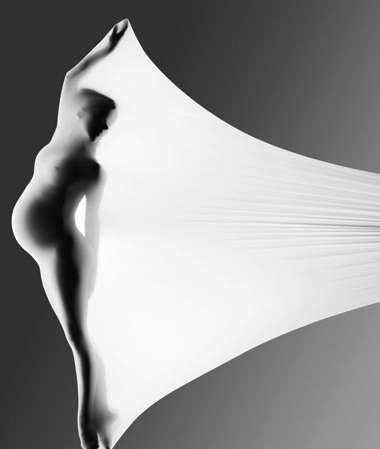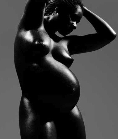 Here we have many different hues of skin, bodies apart from the bellies, of many different shapes, and just as many belly shapes as you can imagine. An orange here, a squash there, basketballs and blimps. Ovals, eggs, circles, spheres, you name it. Each is lit to emphasize shape and weight, just as a sculpture might be photographed. Skin has different textures, and light casts shadows, but always we know that these are living sculptures about to explode in the unique ways of a woman giving birth. We get one dramatic birth sequence.