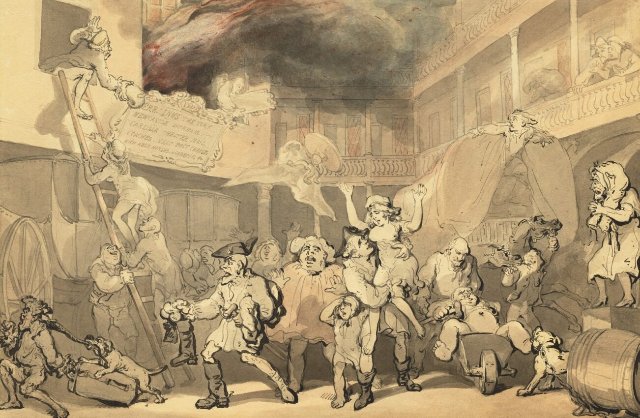 While Rowlandson’s Peregrine Rescuing Emilia from the Inn Fire (c. 1786) has origins in fiction (Tobias Smollett’s Adventures of Peregrine Pickle, first published in 1751), inn fires were also a fact of eighteenth-century travel. Inns were most often wooden structures quite susceptible to catching fire. In this depiction, an essentially terrifying situation—signaled by the billowing smoke and flames—is milked for comic effect through the reactions of figures in various states of distress, disarray, and undress.