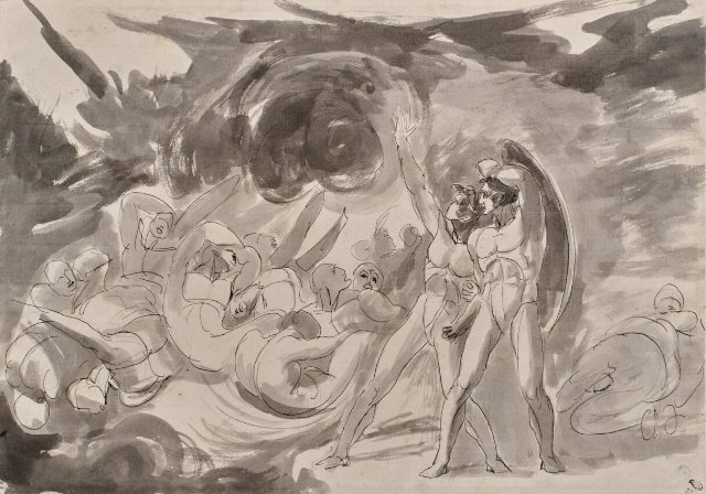As the official portrait and history painter to Queen Victoria, George Hayter (English, 1792–1871) witnessed many of the goings-on at court, which makes plausible the connection of his drawing to a performance of Shakespeare’s Julius Caesar given at Windsor Castle in February 1850. In Hayter’s drawing Scene from Shakespeare’s “Julius Caesar”: The Ghost of Caesar Appears to Brutus (c. 1850) the seated Brutus appears to startle at the sight of Caesar’s ghost, his hand perhaps reaching for the sword behind him.