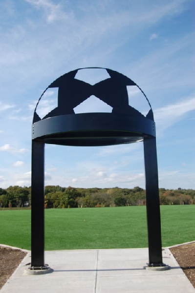 The client had asked for options to choose from. I created three. Two of my initial concepts included players in them, and a soccer ball was abstractly integrated into each of the concepts. One of the options included male and female players that moved with the wind. Another basically had a player making a shot with an extended leg. The third one, and clearly my favorite, had half a soccer ball as a dome-like feature on a gateway. This one was the most abstracted in form and yet the most elegant in concept. Fortunately, the board of the Brookline Soccer Club agreed with my choice and picked the soccer ball domed gateway.
