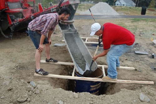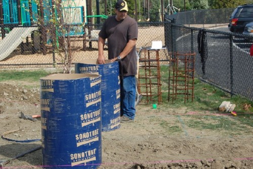 Initially holes are dug for placement of Sunotubes, the thick walled cardboard cylinders that are used for construction sites for sampling and for testing of material strength. In this case the diameter was 3 ft. and the depth was 42 inches to give the proper stability to the Recognition Gateway structure. When the concrete was poured and had set for a while, bolts were set within the cylinders. They were measured and re-measured by placing a metal template the exact length of the piece that assured that the bolts were in exact alignment.