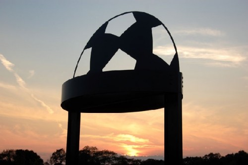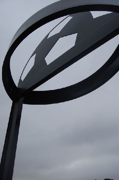 A price was established and overall size of the now called "Recognition Gateway" was established. The size was to be 16.5 ft high and 10 ft wide with an 8 ft wide opening between the two steel beam posts. The general sizes of steel elements were chosen. Beams, steel plates and radius of curves and circles issues were discussed and agreed upon. My concern was that the flat plate "dome" half soccer ball should look like a volumetric rounded piece from a distance not like a flat piece of cut out plate steel. The changing sky would add to the visual sense and quality of the piece.