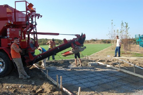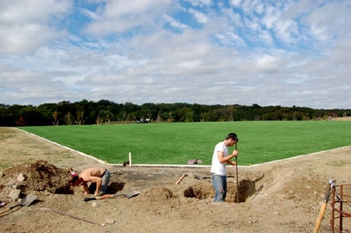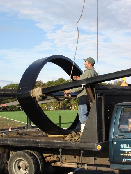 Installation was arranged for Friday, October 5, but the field's turf (the same type used at Gillette Stadium for the Patriots in Foxboro, MA) was not set down yet. October 9 was the actual installation. Prior to that, concrete footings had to be prepared and poured on October 3. All the sizing and pour amounts were worked out by the structural engineer in advance of the actual pour date.