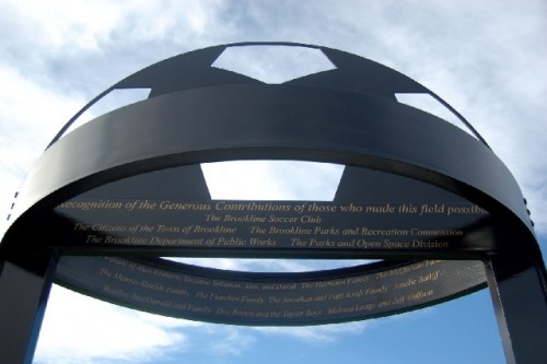 Literally out of the blue sometime last January, I received a call from a prominent Boston developer. After the usual niceties, he explained that the Brookline Soccer Club, a parent organization that fostered the youth travel teams for children of the Town of Brookline, wanted a recognition piece or sign for having raised and donated $300,000 to the Town for a new soccer field. All the donors were to be recognized on it. Though the new park (the first in the town for almost 30 years) would not be ready for at least six months, he wanted me to think about an appropriate element.