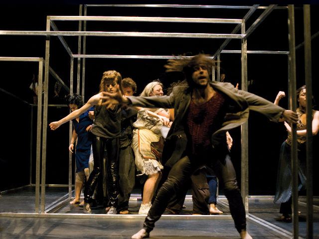 Watching steel frames in the shapes of cubes and rectangles build up and topple on stage, seeing people trapped by them and also liberated graphically, drives home our divided world and the need for human unification. These structures both divide and but also unite. There is hope.
