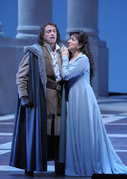 Under the direction of Elijah Moshinsky, the singing actors are in character, notably in roles which move through arcs, from dark to light, or light to dark. Tall columns designed by Michael Yeargen for this joint production with Covent Garden form archways through which the action proceeds. The starkness works wonderfully to keep the rich vocal score on display, front and center.