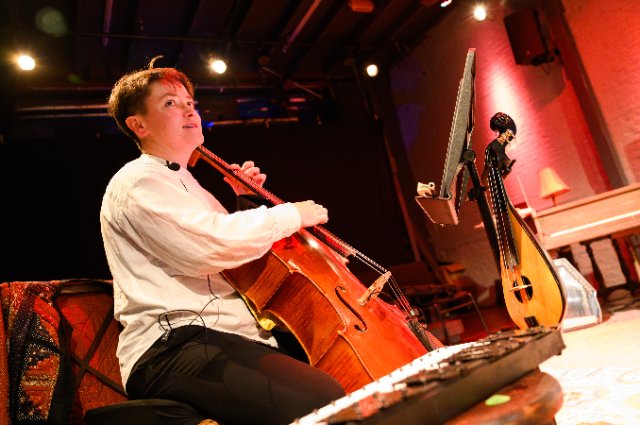A small space is the preferred venue for Ghost Quartet, and OTP’s home at Flax Art & Design suits perfectly with the audience on three sides and artists spread around the edges of the performing space, creating the effect that "they" are among us. The piece is designed for four instrumentalist/singers, but this production includes a fifth (performer, that is, not bottle of whiskey!).