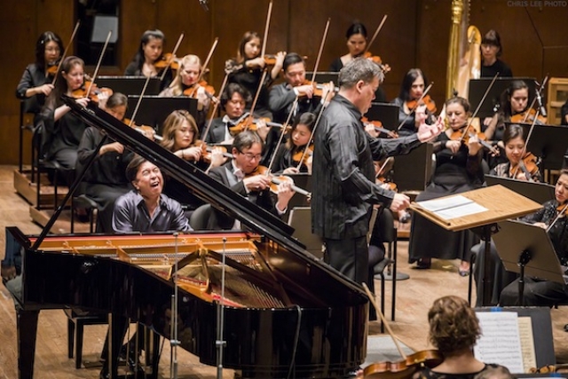 Then followed a long change as stagehands arranged chairs, moved the piano and set the venue up to accommodate the full orchestra. The pianist for Rhapsody was jazz composer Makoto Ozone, and he and Gilbert proved to able collaborators on the full version of this famous piece. True, the long cadenza was a bit self-indulgent, wandering into modal territories before strings, horn and triangle brought the piece back home, but the strong playing of the orchestra made this familiar Gershwin work sparkle.