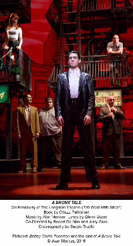 This ultimately is Calogero’s story. It’s a tale in which book writer Palminteri captures a specific ambiance with flair. The design team brings to vivid life this stylish, tough and tender tale, one which produces tears and laughter. Scenic designer Beowulf Boritt’s visually-striking set captures a sense of community, its blue collar, gruff character and colorful nature. The set isn't literal, befitting a musical.