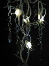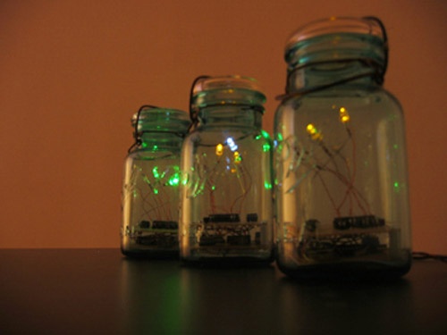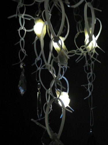 "Fireflies" by John Schimmel are networked LEDs that resemble fireflies caught in mason jars. The trapped fireflies respond to your tapping and wirelessly inform communities of fireflies in other jars about the pattern you've tapped. Carlyn Maw's "Constellations" employs LEDs and gold on canvas to represent social networks through constellation-like patterns. Finally, Miriam Songster's "Chandelier" uses plastic cable ties, Austrian crystal, and white LEDs covered in Crisco shortening to question our notions of the beauty and value of certain materials over others. "Chandelier" will be visible at all times in our gallery's large storefront windows.