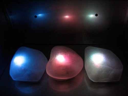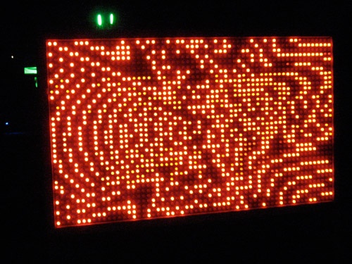 The five art works on display in our Adams gallery are the product of seven artists. Two artists, Rory Nugent and Leif Krinkle, were part of our last show "Sustainable Energy Art" and return with new works. Leif's "Luscious Electric Delight" a play on LED, is a 48 x 28" display consisting of 2,100 red LEDs. "Luscious Electric Delight" is programmed to create and display algorithmically generated psychedelic patterns. Rory, Minsoo Lee, and Gregory Stringer worked together to produce "Stoneglow" a collection of stone-shaped devices that change color depending on their relationship to one another. The viewer can produce unique color combinations by playfully moving these stones relative to one another thus changing the color of the LEDs embedded inside.