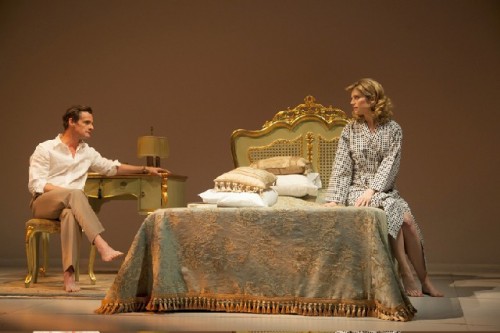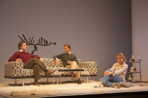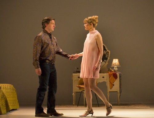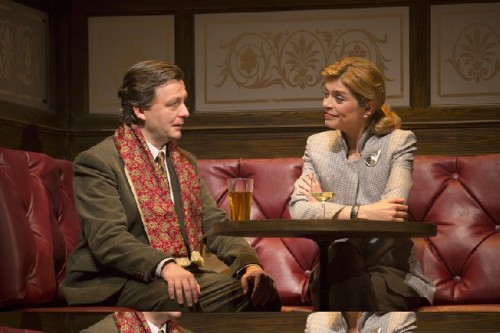 In this Huntington production of Betrayal, the exquisite sets and lighting act as contextural characters themselves. From the tawdry looking lovers' flat at the end of Jerry and Emma's affair to the elegant 1970s family home living room of Robert and Emma, the furniture and simple accoutrements have dialogue themselves.
