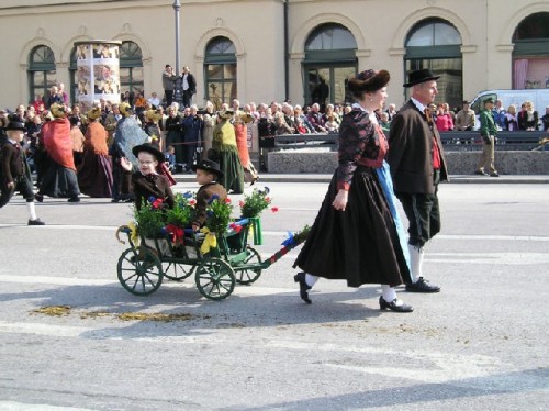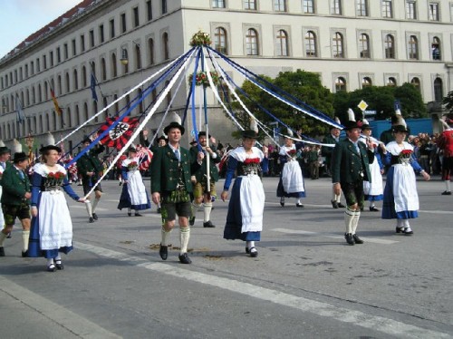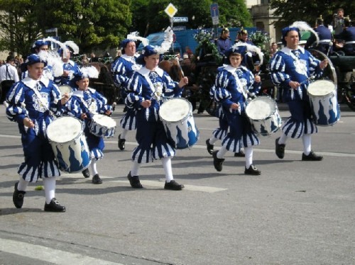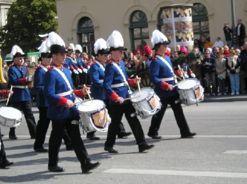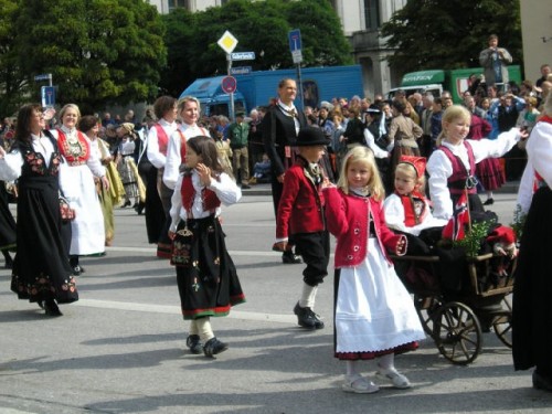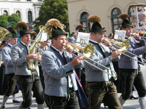 On opening day Bavarians wearing traditional costumes filled the streets; many others came from out of town to take part in the festivities. The inner city was cordoned off and devoted entirely to the festival parade. I was able to squeeze my way through dense rows of spectators to take photos of some of the multi-ethnic groups and bands as they went by. Afterwards we enjoyed beer, served in one-liter steins, along with sausage and potatoes in a downtown restaurant. Unfortunately, due to heavy demand, they had run out of Weisswurst (white sausage), a local favorite served with a special sweet mustard.