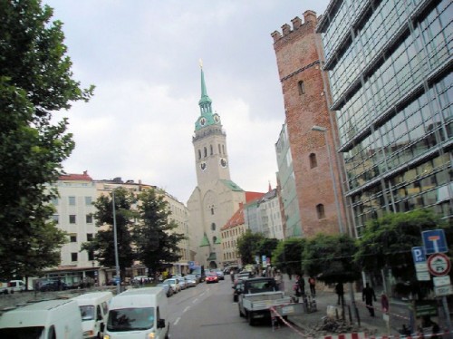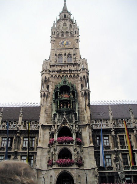 To the left of the square is the 15th-century Gothic cathedral, the Frauenkirche, the trademark of Munich with its unadorned but magnificent two towers with green domes. To the right is the late-Gothic Neues Rathaus (new town hall) with its monumental Glockenspiel. Rhythmic sounds of 43 bells tolled, spreading in waves, while colorful carillon figures dressed in traditional clothes and set in the balcony of the tower danced to the style of Munich folklore. Directly opposite the Rathaus, the Alter Peter, the oldest church in Munich, and the new Jewish Synagogue and Cultural Center were the other highlights here. The final stop before returning to the train station was Stachus, the pedestrian shopping zone.