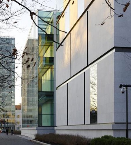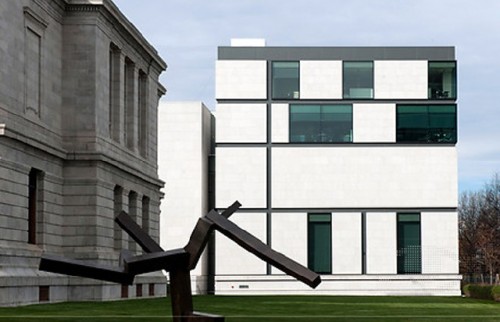The new wing does not call attention to itself. It has little real distinct character except being modern. This makes the simplicity of the minimalist glass and metal structural design work a contemporary counterpoint to the detailed Guy Lowell ornate Beaux Arts building.