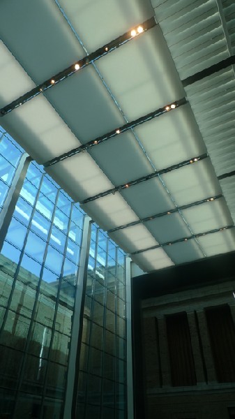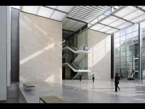The glass walls both reflect and allow views of the museum and its setting. It will be interesting to see how this space is actually used in the future. Maybe, more monumental art will be placed there to enhance a sense of scale in the three story high space?