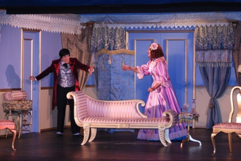 All must deal with the odious Bastien Andre (a deliciously lascivious and persistent Garnett Smith) who, not only is the owner of the outstanding bills, he also holds the trump cards of money as well. And he has his eye on Marie. As the plot thickens (into a mishmash of farce clichés), Jean-Francois is ultimately convinced that the plan might work. Thus he disappears from life and re-surfaces as his imaginary twin sister, a widow both mad and madcap. Shades of Brendan Thomas’ turn of the 20th century hit “Charley’s Aunt”. Once Millet/Lyon trades his painter’ smock for a pink dress and a wig all bets are off and the zany story spins this way and then that way.