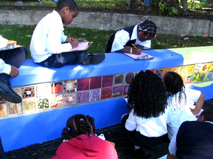 And just how many individuals does TransCultural Exchange represent? Mary stated that there are about 22 global core or contact members as well as 100 plus artists at any given time participating in specific projects. "It's a lot of people," she added with emphasis and growing all the time. The challenging part is to come up with interesting concepts and doable projects. The idea for the Tile Project emerged while she was a resident at MIT in 2002. She was working with the laser jet cutter and in the glass lab. "The idea of the tile project is that it was easy to create, ship and install. Tiles represent one of the most ancient and democratic forms of art making. As they have traveled around the world it is interesting how each group or venue opts to install them differently. So far there have been 22 global sites. Each 'contact' artist went to another site. So an artist from India, for example, went to Spain. They each get an airplane ticket and stay with other artists."
