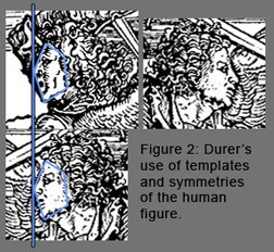 Printmakers often transfer an initial drawing to a printing plate. This can be accomplished by making tracings, and flipping them over to transfer the images. If you trace and flip the angel’s faces you can see that they are almost the same outline, same basic location of features, same basic pentagonal outline around the face, etc. They differ in ornamentation (such as hair, eyebrows, dimples, clothing), but they are the same in underlying structure (figure 2). So now the question is why did Durer place these two angels in these two positions? Why aren’t they somewhat higher or lower on the page? Why these symmetries and not some other pattern?