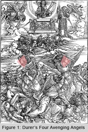So how did he do it, really? In the exhibit, you can see the entire fifteen prints of the Apocalypse series, including The Four Avenging Angels. A quick look reveals it is symmetrically composed. You might notice that around a central vertical axis to the right and to the left there are many shapes that reflect each other, for example, the two middle angels’ faces (figure 1, in red).