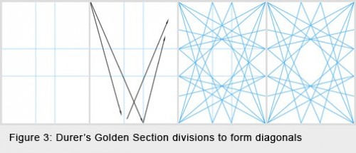 [Note: quotes are from The Painter’s Manual by Walter L. Strauss (New York: Abaris Books, 1977), which is an English translation of Durer's treatise on measurement; and, Albrecht Dürer, The Writings of Albrecht Dürer, ed. and trans. William Martin Conway (New York: The Philosophical Library, 1958), p. 231. Diagrams were constructed by the author on the basis of diagrams and writing from Bouleau, The Painter’s Secret Geometry: A Study of Composition in Art (Harcourt, Brace and World 1963), plus Panofsky's The History of the Theory of Human Proportion as a Reflection of the History of Styles (Doubleday, 1955) and The Life and Art of Albrecht Durer (Princeton, 1955), as well as from graphics evidenced in Duerer's Four Books on Measurements. A delightful discussion of the Golden Section can also be found in Mario Livio’s text The Golden Ratio: The Story of PHI the World’s Most Astonishing Number (Broadway, 2003). ]