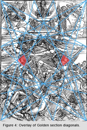For example he often built a cross through the center of the image, with phi plotted twice for each outside edge of the rectangle. Then, he sometimes used a simple system of connecting each outer point of the cross to each other, to arrive at a faceted, diamond-like structure built up from many diagonals (figure 3). The pattern created dynamic symmetries top to bottom and side to side and corner to corner. Here then is this system overlaid with Durer’s Four Avenging Angels, and the middle angel’s faces still plotted in red – a nearly exact match (figure 4).