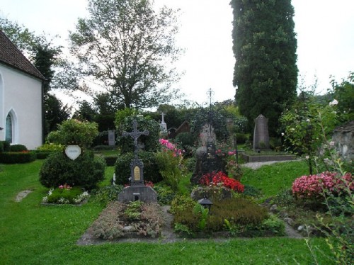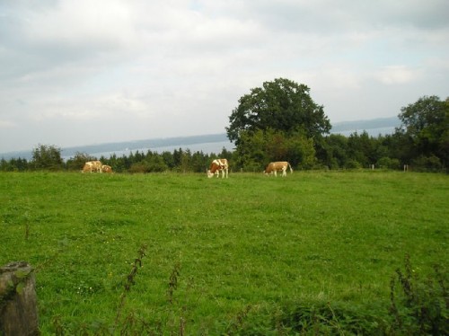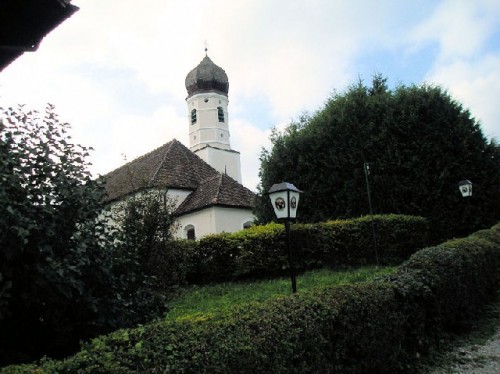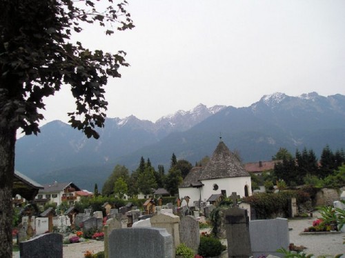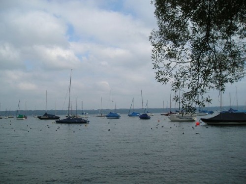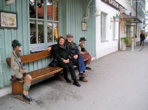 The chilly fall weather had already descended over the lake, as evidenced by the many covered sailboats on the Starnberger See. Bundled up, we walked by the water's edge, admiring the multi-hued foothills at a distance. We visited a church sited high in the meadow, overlooking the lake. The white-washed church, with an onion-domed tower, a well-groomed cemetery, and cows grazing nearby, made beautiful pastoral scenery.