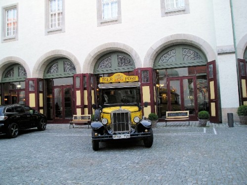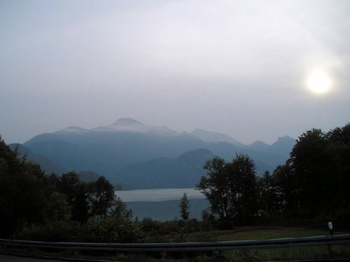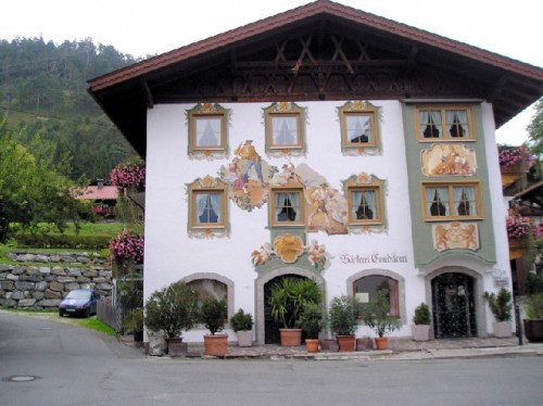 On the drive south toward the Austrian border, the light over the lake and the mountains was indeed spectacular. After several stops to enjoy the scenery, we finally arrived in Garmish late in the day. This was yet another charming mountain town. Hanna asked a local passer-by to recommend a good restaurant. Following the directions given, we drove uphill to the Panorama restaurant, which was also a hotel. The view from its deck of the surrounding hills definitely fit the name. Unfortunately it was getting dark and was too cool to sit outside. We settled for an indoor table with a window view, to gaze at the flickering lights below. I ordered the local trout, served with almond butter. It was delicious.