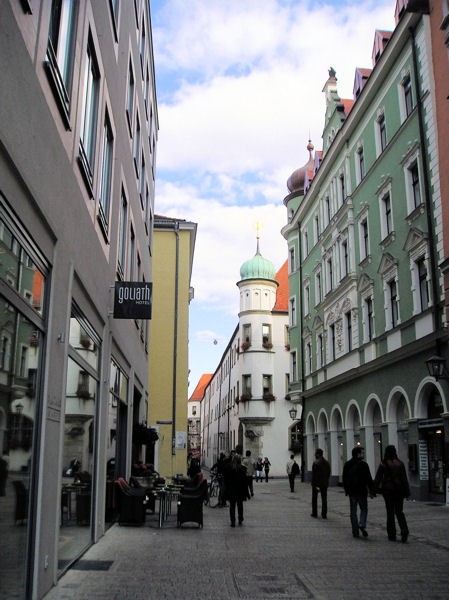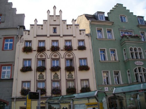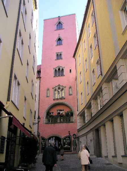 The Gothic St.Peter's Cathedral dominates the Regensburg skyline. The Dom Platz (Cathedral Plaza) is the center of the city's social life, with many outdoor cafes. Off the Cathedral cloisters is the All Saints Chapel. Other landmarks are: Portal Praetoria or the gate in the Roman wall, the Romanesque St. Ulrich's Church, the13th century Baunberger Tower, the Goliath House with outside frescoes (1573), and the Old City Hall, where the Perpetual Diet met from 1663-1806. The Thon-Dittmer House is the patrician residence with Renaissance courtyard, and the Regensburg Theatre is where operas and plays are performed. Among the buildings that stand out architecturally are the Church of the Dominicans, the Gothic basilica with columns and the Palace of the Prince of Thurn und Taxis, as well as the royal villa built for King Maximillian of Bavaria. The pastel-colored town houses with zigzag roof lines delight the eye at the Arnulfsplatz, not to mention the beautiful houses along the Danube.