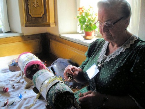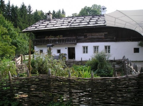 Traditional landscapes included large water-powered mill-wheels, which activated the whetstone to grind grain; horses and oxen to pull the harvest wagons; cows to give milk for butter and cheese; and sheep to produce wool for clothing. Smiths and whetstone makers engaged in strenuous labor, while artisans demonstrated the traditional crafts of lace-making and pottery. I purchased a hand-made ceramic plate with a center motif of three fish, but resisted the grocery and bake shop. The museum's restaurant, with flowers bursting out of balcony flower pots and its beer garden, made a lovely photo.